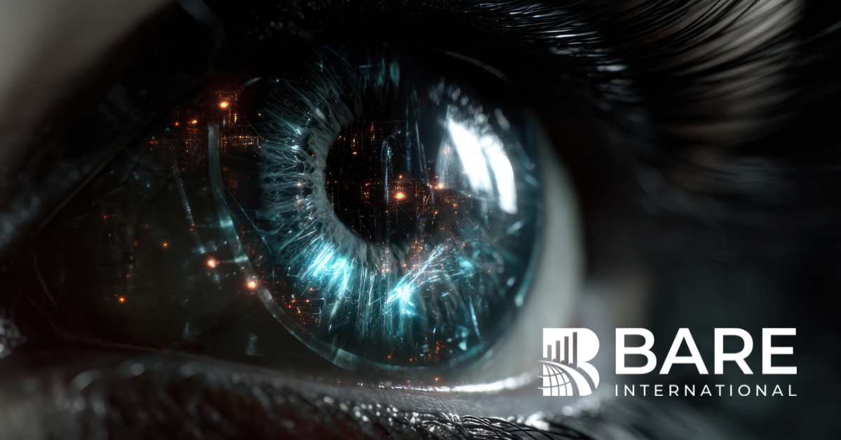 A high-resolution close-up of a human eye with a glowing blue iris reflecting an illuminated urban skyline, symbolizing deep analysis, observation, and futuristic insight. The image conveys themes of innovation, intelligence, and sharp perception. The BARE International logo is positioned in the bottom right corner, reinforcing the brand’s focus on evaluation and excellence.
